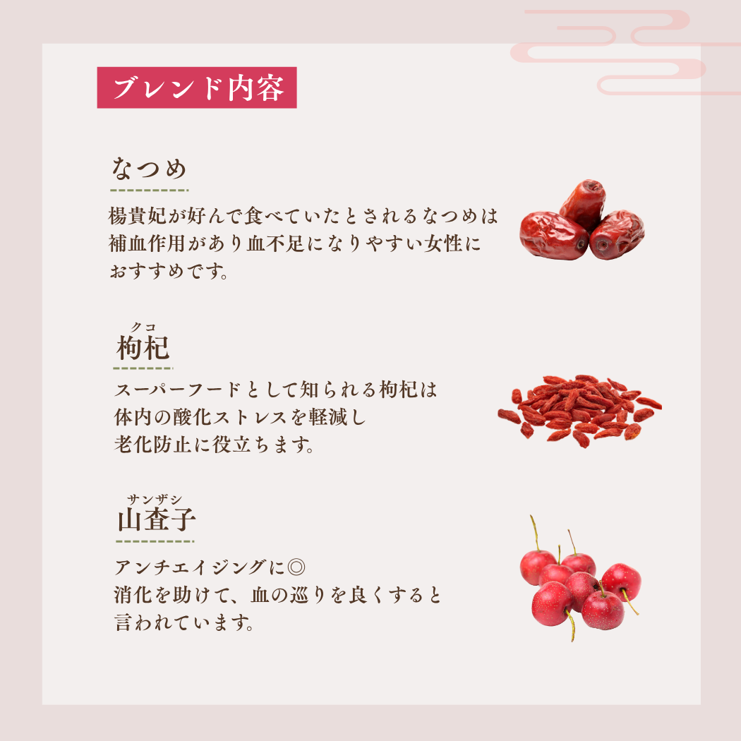 なつめをベースにしたこのブレンドティーは、肌の潤いを保ち、